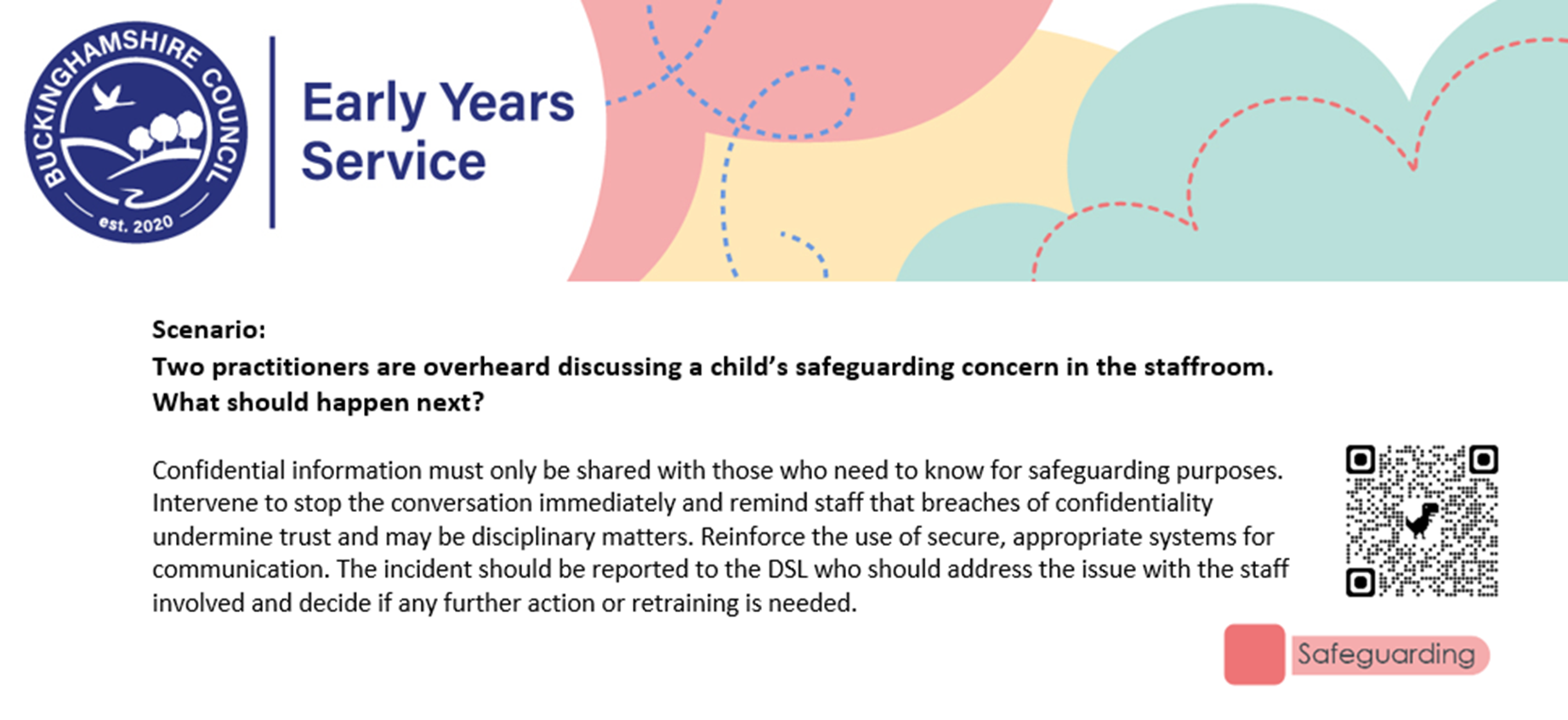 - Scenario: Two practitioners are overheard discussing a child’s safeguarding concern in the staffroom. What should happen next?